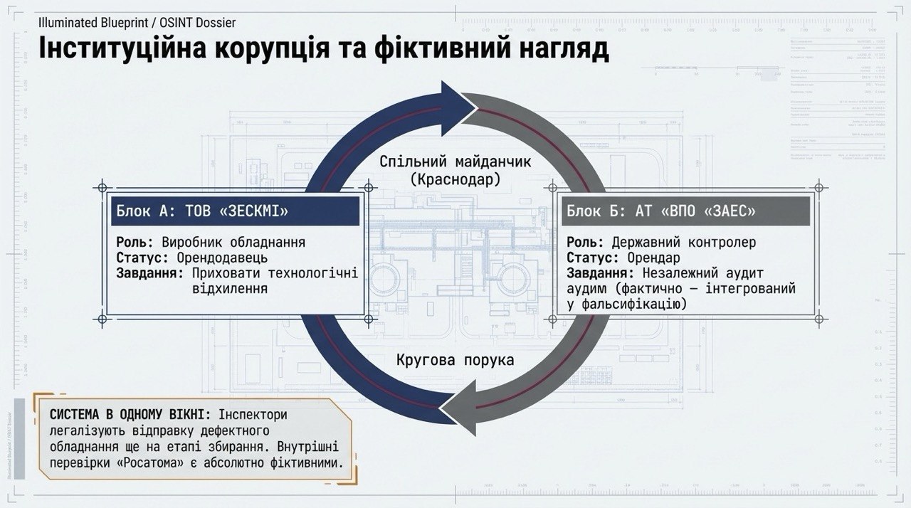 Цей конфлікт інтересів фактично формалізує всі процедури державного нагляду, зводячи їх до принципу «в одному вікні». Замість того, щоб бракувати дефектні вироби та вимагати використання сертифікованої сталі 08Х18Н10Т, інспектори АТ «ВПО «ЗАЕС» інтегровані у процес системного приховування технологічних відхилень ще на етапі складання обладнання. Така кругова порука робить внутрішні перевірки «Росатома» абсолютно фіктивними, легалізуючи відправку потенційно небезпечного обладнання на будівельні майданчики як всередині Росії, так і за кордоном.