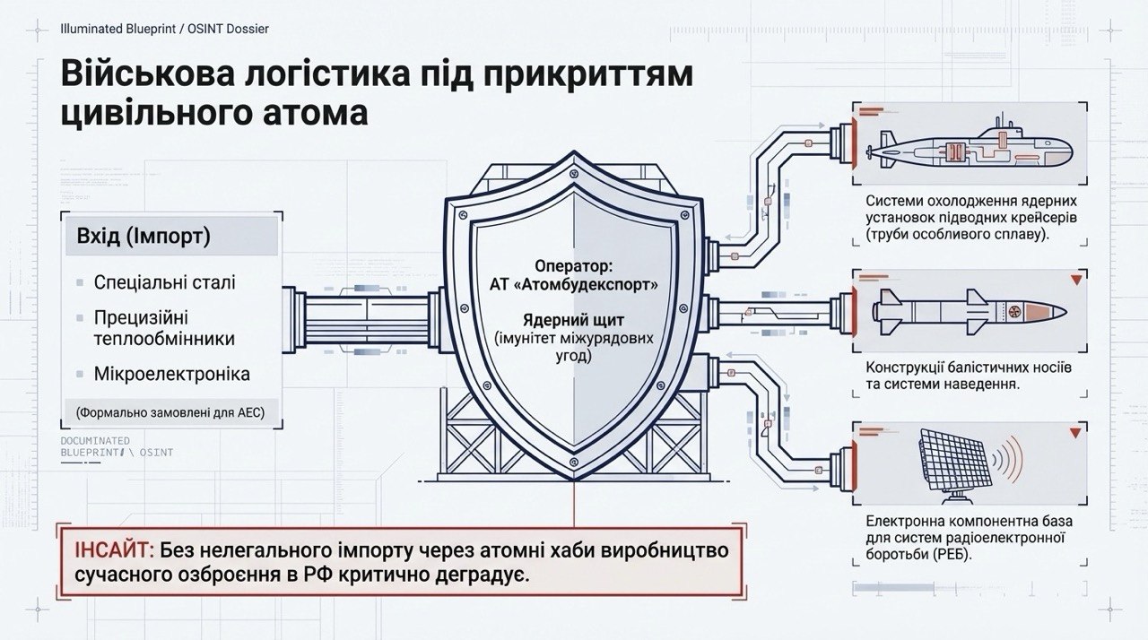 Продукція подвійного призначення, що формально контрактується для потреб атомних електростанцій, є життєво необхідною для виробництва сучасного озброєння, систем радіолокації, атомних підводних човнів та підтримки критичної військової інфраструктури. Йдеться не просто про загальнопромислові деталі, а про високотехнологічні компоненти, легальний доступ до яких наразі повністю заблокований для російських оборонних підприємств. Спеціалізована сталь, прецизійні теплообмінники, мікроелектроніка та складні системи автоматичного управління, які закуповуються нібито для цивільних реакторів, мають пряме застосування у військовому суднобудуванні, ракетобудуванні та аерокосмічній галузі.