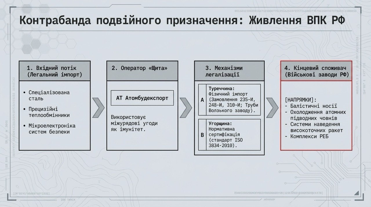 Для легалізації цього безперервного транзиту використовується механізм так званого ядерного щита. Будь-які вантажі, спрямовані на об'єкти Росатома, отримують імунітет під виглядом обладнання, необхідного для безпечної експлуатації реакторів. АТ Атомбудекспорт виступає центральним оператором, який приховує постачання під егідою виконання міжурядових угод, створюючи ідеальну ширму для прихованої військової логістики.