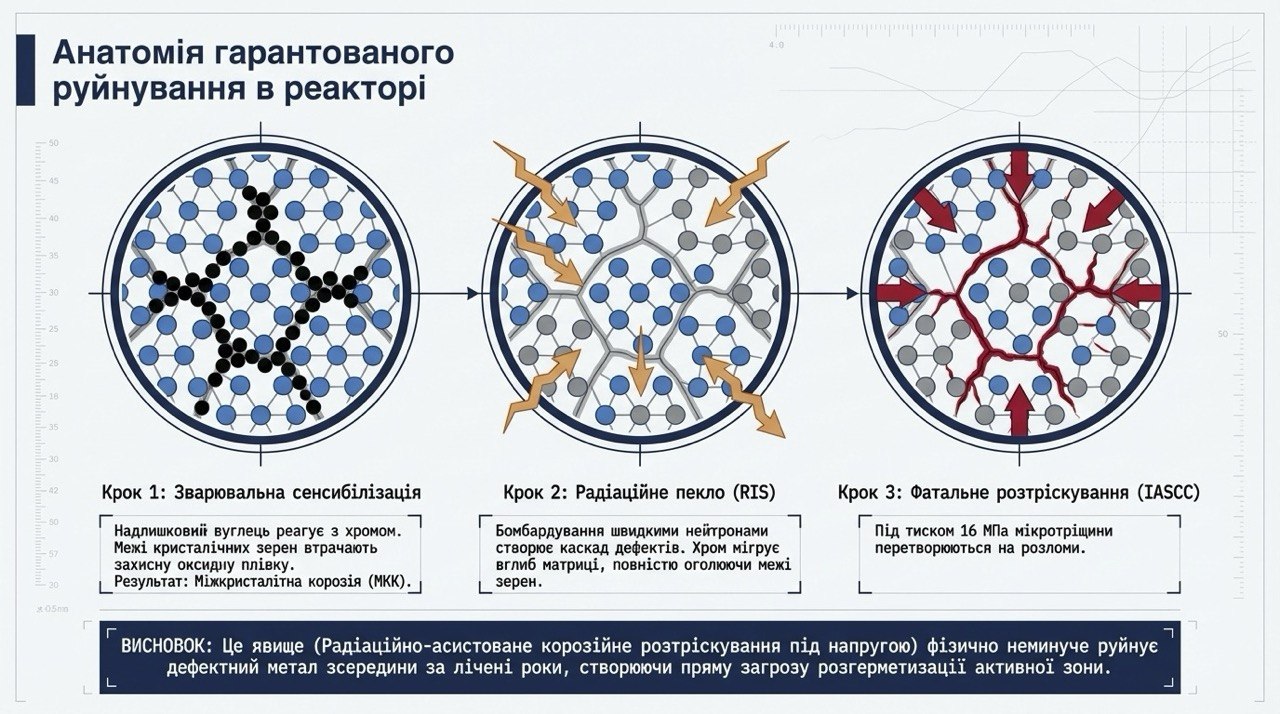 Кожен із виявлених факторів — використання високовуглецевої сталі 12Х18Н10Т, порушення температурних режимів зварювання, впровадження несертифікованих кріплень та фіктивний державний нагляд — є серйозним порушенням ядерної безпеки, який перетворює російські реактори на бомби уповільненої дії. Ці фізичні відхилення неминуче та гарантовано призведуть до атомного руйнування критичних вузлів, розгерметизації систем охолодження та радіаційних аварій.